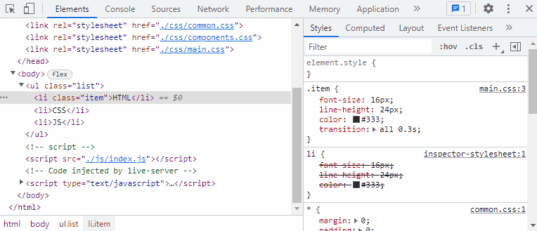 • 요소에 새로운 CSS를 insdpector-stylesheet 로 추가 하기